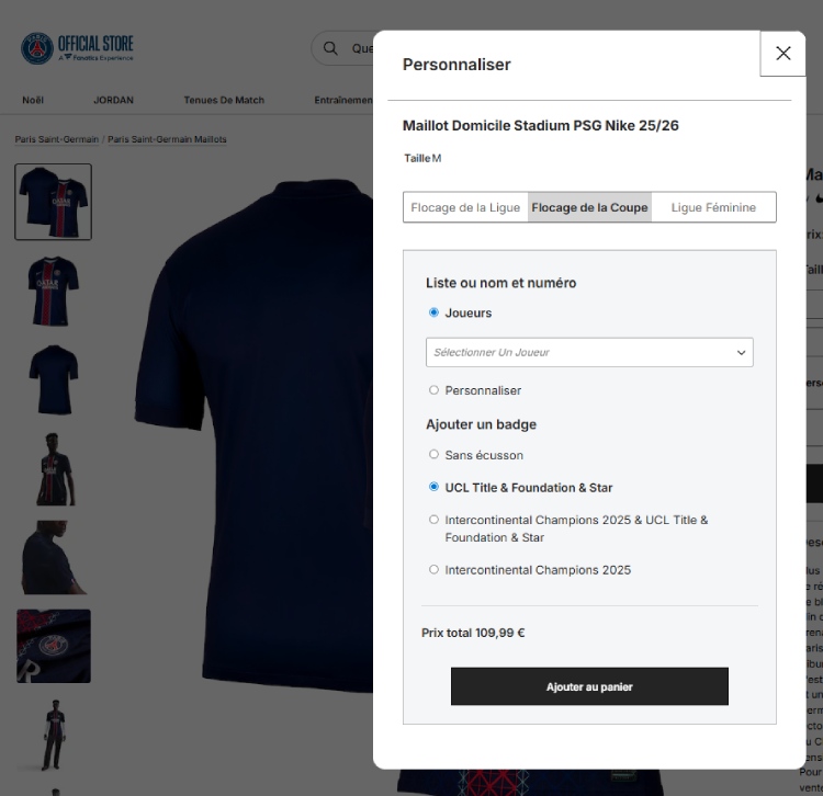 Pour cela, vous devez d'abord choisir votre maillot, puis votre taille, et ensuite cliquer sur Personnaliser. Il vous est alors proposé le flocage de la Ligue ou le flocage de la Coupe et vous pouvez ensuite ajouter le badge "Intercontinental Champions 2025". Le simple badge de vainqueur de la Coupe intercontinentale coûte 8 euros supplémentaires.