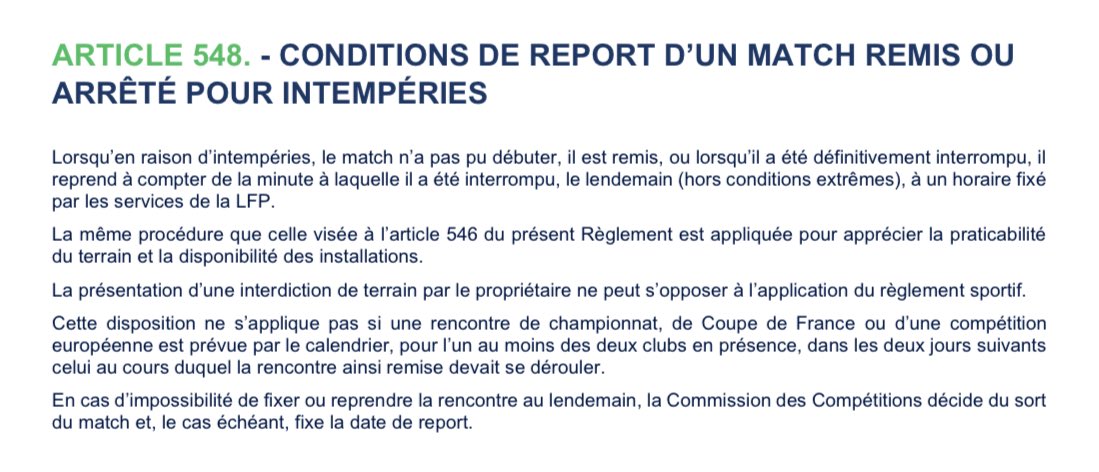 Si un report devait finalement être acté, les règlements assurent que la rencontre doit être jouée le lendemain, ce qui n'arrangerait aucune des deux équipes : Marseille a déjà prévu de partir en stage en Italie quand bon nombre de Parisiens sont attendus à la cérémonie du Ballon d'Or. Mais si la partie ne peut pas être jouée le lendemain, notamment si la météo ne s'est pas améliorée, c'est ensuite la Commission des Compétitions de la LFP qui décide de la date.