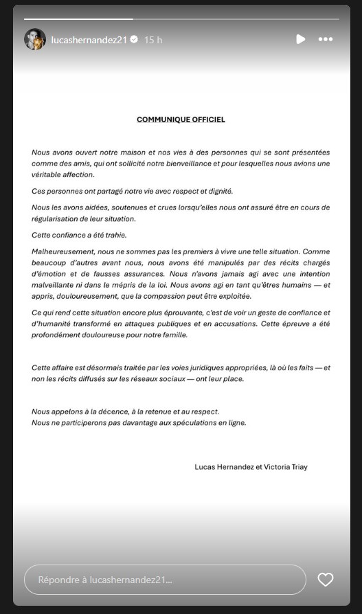 « Ce qui rend cette situation encore plus éprouvante, c'est de voir un geste de confiance et d'humanité transformé en attaques publiques et en accusations », regrette également Lucas Hernandez, qui ajoute que « cette affaire est désormais traitée par les voies juridiques appropriées, là où les faits - et non les récits diffusés sur les réseaux sociaux - ont leur place ».