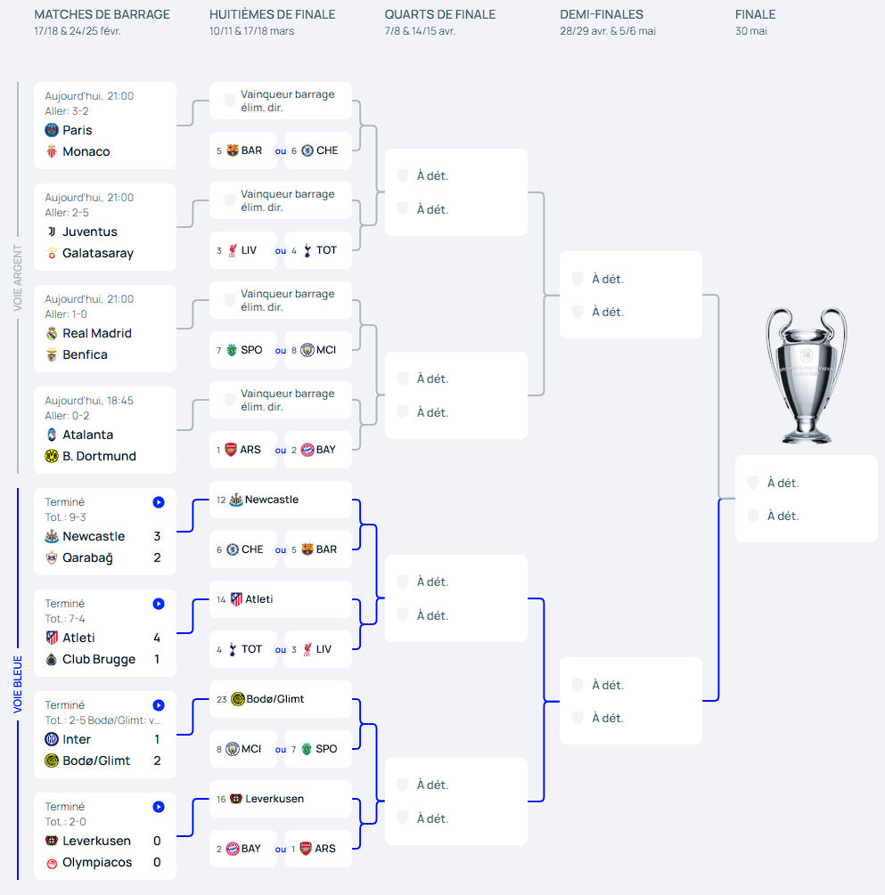 Les premiers barrages retour de la Champions League se sont joués ce mardi soir et toute une partie des participants aux huitièmes de finale sont donc connus, la partie du tableau de la Champions League appelée « voie bleue » par l'UEFA. Cette partie n'est pas celle du PSG mais elle a permis de dégager les quatre huitièmes de finaliste manquants : Newcastle, l'Atlético Madrid, Bodo/Glimt et Leverkusen.