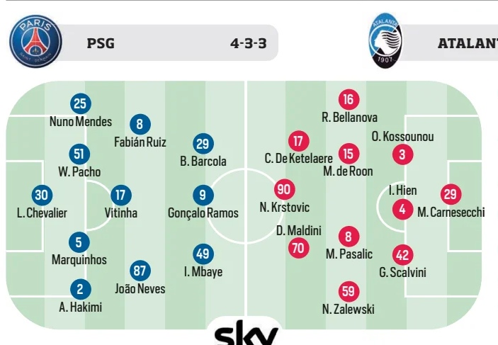 Pour La Gazzetta dello Sport et Sky Italia, Kossounou sera axial droit avec Djimsiti axial gauche et Hien en libéro tandis que le Corriere dello Sport voit plutôt Scalvini à la place de Djimsiti au poste d'axial gauche. en France, L'Equipe mise sur Scalvini à droite et Djimsiti à gauche, tandis que Le Parisien table sur Scalvini à droite et Koussounou à gauche...