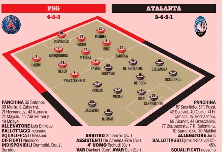 Du côté du Corriere dello Sport et de Sky Italia, on voit le même onze, mais avec Ibrahim Mbaye à la place de Kvara, comme L'Equipe en France. Personne ne voit donc Lee Kang-in démarrer en Italie.