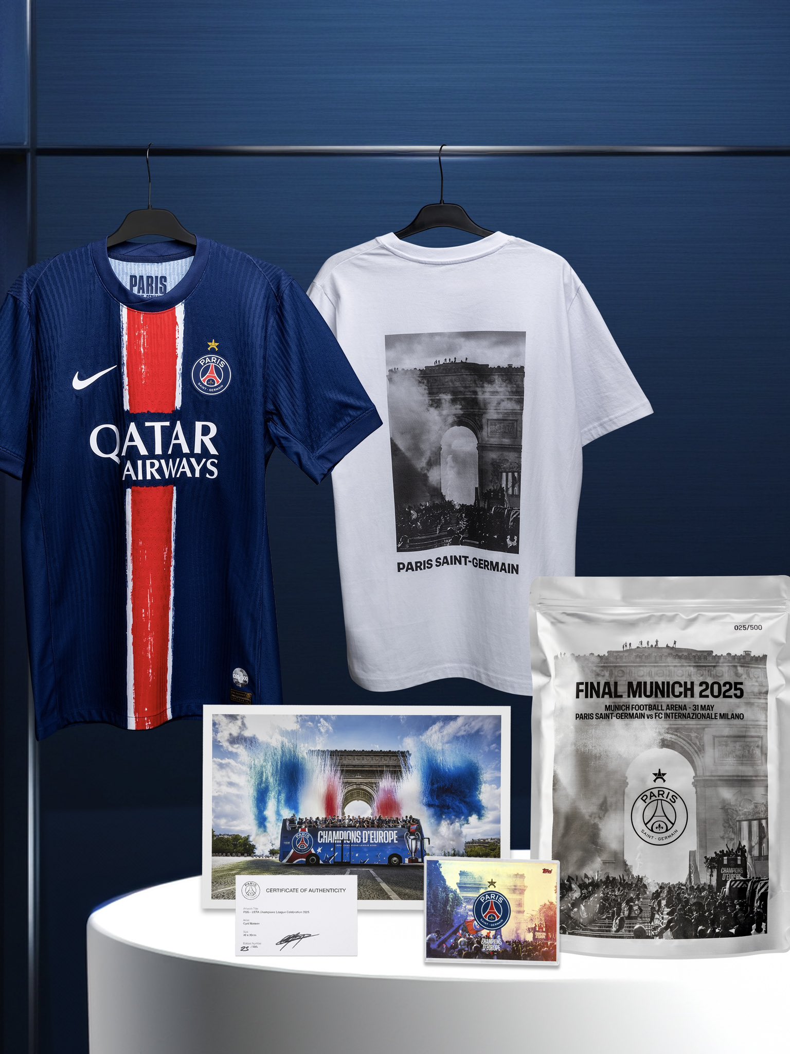 Ce pack, en édition limitée, était vendu au prix de 301 euros et comprenait un maillot match PSG 24/25 collector et numéroté avec le flocage « Champions »,  un tirage de la photo historique devant l’Arc de Triomphe, une carte Topps en tirage limité et un tee-shirt collector. Mais quelques secondes après sa mise en ligne, ce passe produit en 500 exemplaires était déjà en rupture de stock.