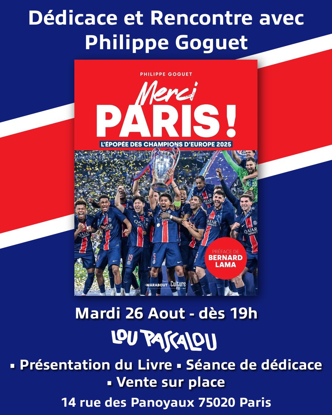 Un mois après une première séance, nous vous donnons rendez-vous ce mardi 26 août à Paris pour une deuxième séance de dédicaces du livre « Merci Paris ! », écrit et illustré par des membres de CulturePSG.