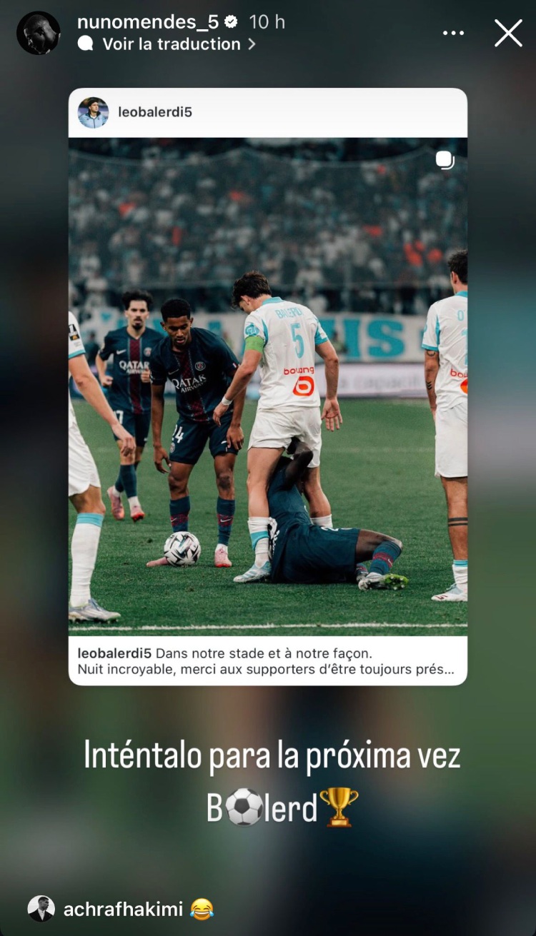 Auteur d'un gros match jeudi soir face à l'OM, Nuno Mendes a chambré Leonardo Balerdi sur Instagram après la victoire du PSG aux tirs au but lors du Trophée des champions.