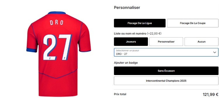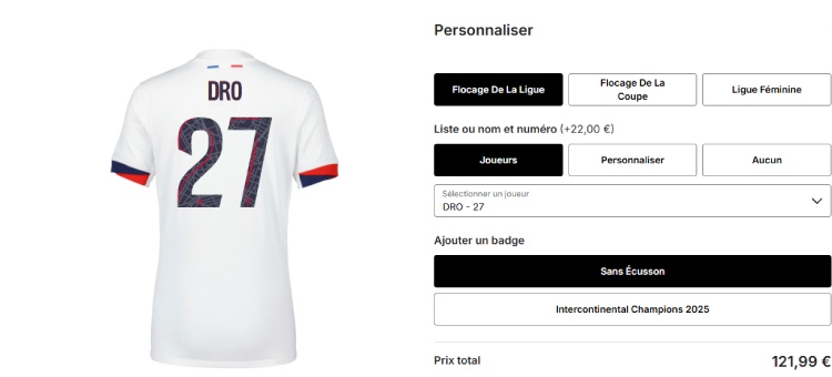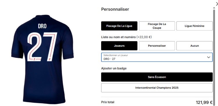 Pour acheter le maillot du PSG floqué Dro 27, il vous suffit de vous rendre sur la boutique en ligne du PSG ici, de sélectionner le maillot de votre choix (domicile, extérieur, third ou fourth), votre taille (attention, toutes ne sont pas disponibles selon le maillot) puis de cliquer ensuite sur "Personnaliser" et de défiler jusqu'à tomber sur Dro 27. La personnalisation coûte 22 euros supplémentaires.
